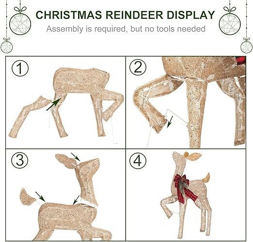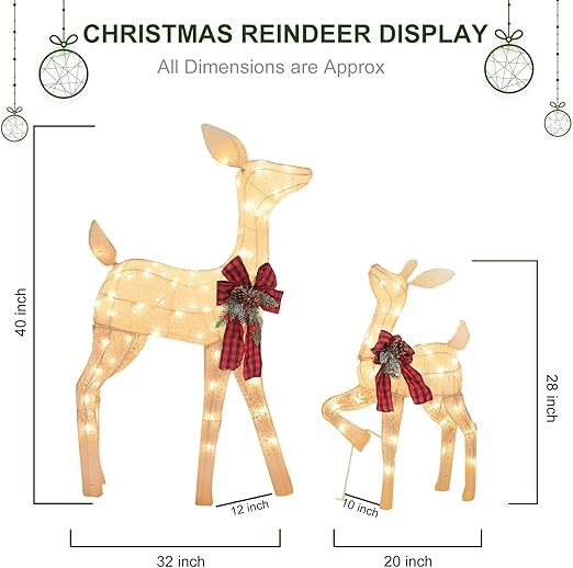 • 105 Pieces Lights: This pre-lit reindeer set come with 105 incandescent clear warm white lights in total. (Doe 70 lights / Fawn 35 lights). The dimension of the Doe is 32'' L x 12'' W x 40'' H, Fawn is 20'' L x 12'' W x 28'' H