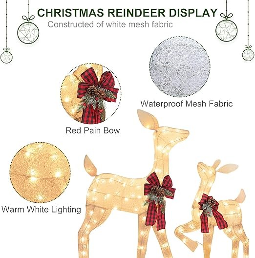 • Christmas Reindeer Decorations: This white glittering set Doe and Fawn comes with beautiful red, buffalo plaid bows to dress them up in your yard just a little more. It turns your yard into a winter wonderland and light-up the outdoors for the holidays
