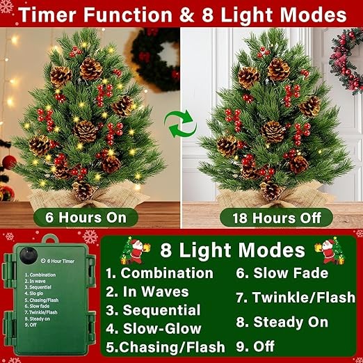 • 【Timer Function】:Designed for convenience, this mini Christmas tree features an automatic timer that keeps the warm LED lights glowing for 6 hours before switching off for 18 hours. Let this artificial lighted Christmas tree create a consistent holiday ambiance day after day, with no need to manually operate—just set and enjoy!