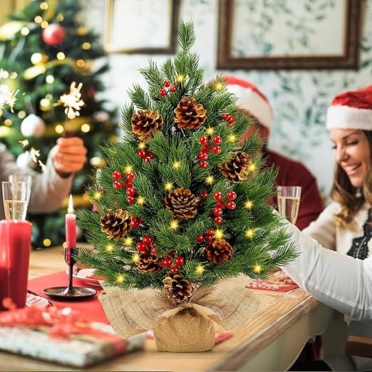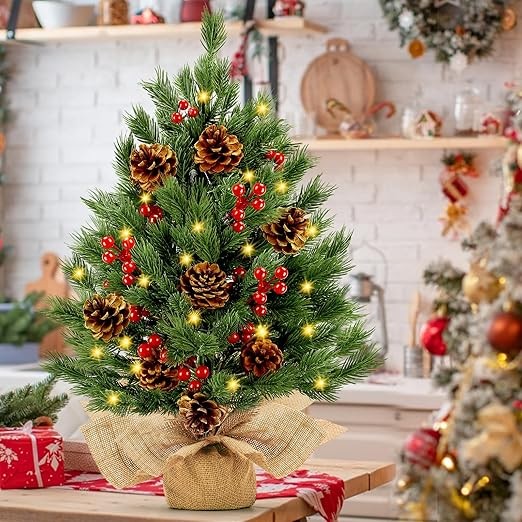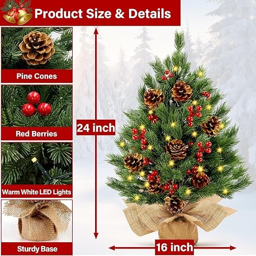 • 【24 Inch Artificial Tabletop Christmas Tree】:This charming 24-inch mini Christmas tree is an exquisite artificial tabletop Christmas tree, featuring a robust 4x2-inch burlap-wrapped wooden base. Adorned with 55 pine branch tips, 50 warm white lights, 10 pinecones, and 30 red berries, it's the perfect artificial Christmas tree to bring a cozy, festive atmosphere to any space!