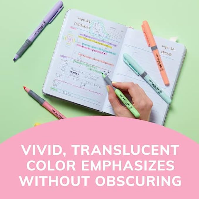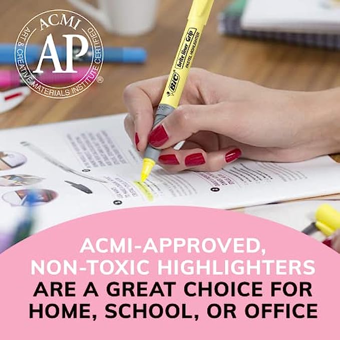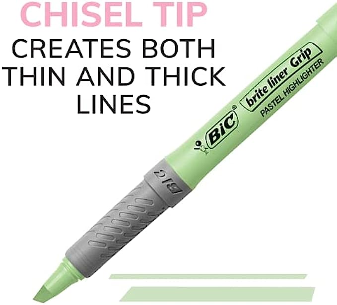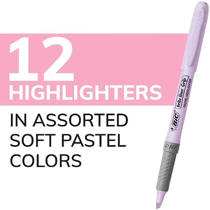 BIC Brite Liner Grip Pastel Highlighter Set, Chisel Tip, 12-Count Pack of Pastel Highlighters in Assorted Colors, Cute Highlighters for Bullet Journal Exercises, Note Taking and More