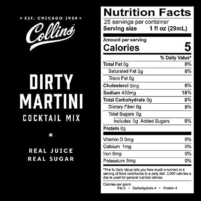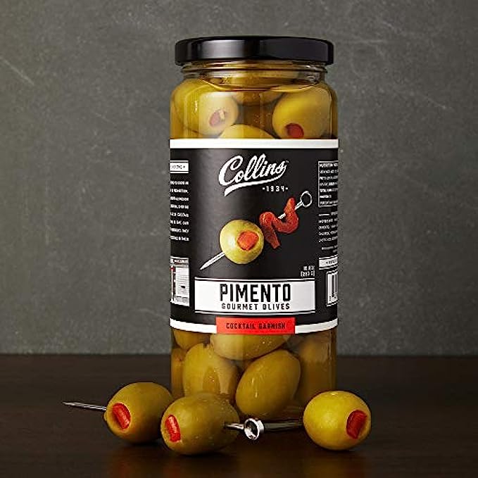 • PREMIUM INGREDIENTS - Formulated with professional bartenders, Collins dirty martini mix is made with 100% real olive brine for that iconic dirty martini flavor. Our pimento cocktail olives are the perfect garnish for martinis, bloody marys and more.