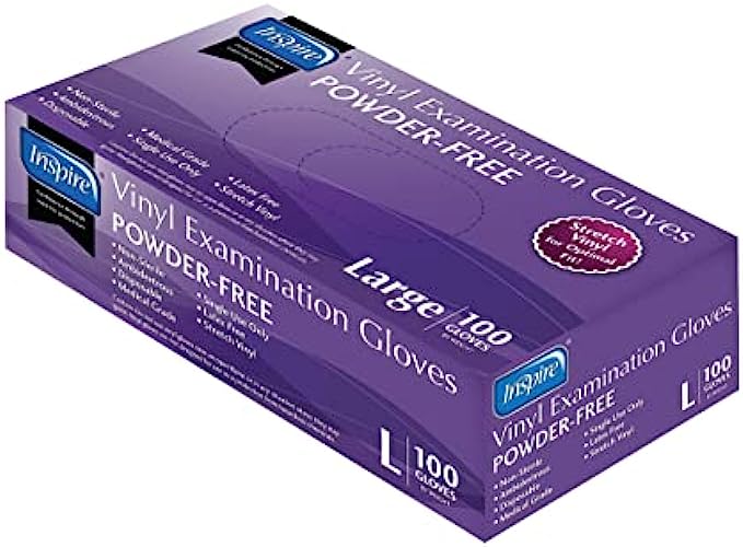 Vinyl Imported PRE-COVID QUALTY: Remember when disposable gloves were strong, rip free and durable? These Inspire Gloves are the Original Quality. Say NO to cheap gloves that do NOT offer adequate protection. Inspire Vinyl gloves offer the security and strength demanded by today's professionals. Also see our Inspire Nitrile Gloves and a full selection of Inspire gloves disposable latex free, latex gloves , rubber gloves and medical gloves. VINYL STRETCH - STRENGTH AND DEXTERITY: Inspire Stretch Vinyl Gloves provide strong protection every time. Rugged vinyl material is rip and puncture resistant, yet offers a secure fit, ease of movement, superior tactile control, and ultimate dexterity. TRUSTED BY PROFESSIONALS: The exam grade glove trusted by medical professionals. Whether emergency services, doctors, nurses or food and household use, Inspire disposable gloves hold up to the job at hand. Medical gloves you can put your trust in. LATEX FREE PROTECTION: Inspire vinyl gloves are NOT made with any latex in production. Powder Free Nitrile Stretch gloves. CONFIDENCE - GLOVES THAT HOLD UP TO THE JOB AT HAND: When your protection is on the line, you demand a glove that will hold up. Inspire Gloves give you the confidence to tackle all scenarios securely and safely. 100 gloves per box, 1000 gloves per case. Case of 10 boxes