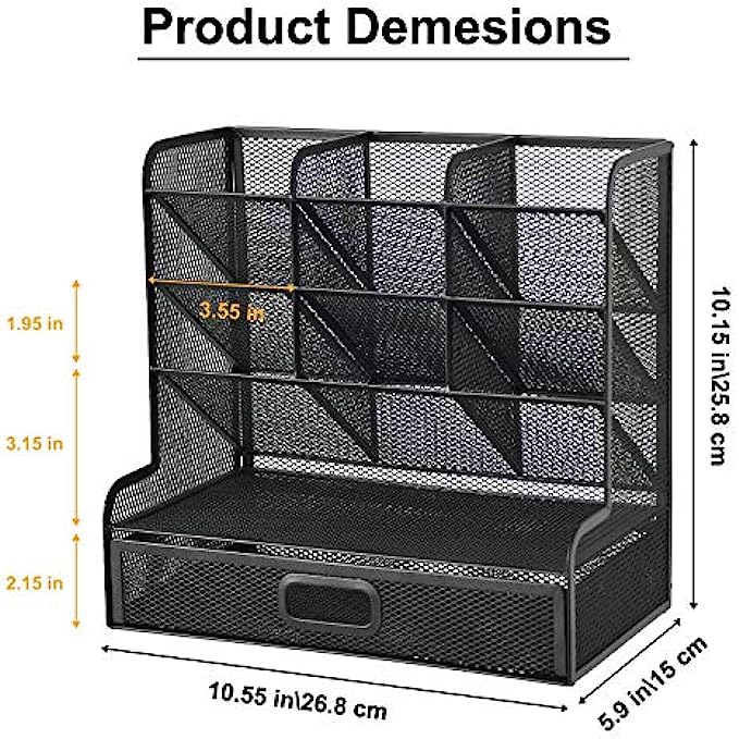 ✏️【ULTRA-LARGE CAPACITY】: Set of 9 compartments with a rack, enough compartments to allow for some basic organization. It's designed a drawer to store a wide variety of items. , multifunction help you arrange the desk gadgets and stationary clean and tidy.The best and safest storage option for you. Perfect Size:10.5*5.9*10.1inch.