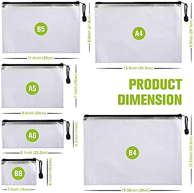 • 【What You Can Get】24 pcs plastic zipper folders in 6 size(4pcs for each size). They are B4 (15.35×11.22Inch), A4 (13.5×9.5inch), B5 (11.4×8.6 inches), A5 (9.4×7.1 inches), A6 (9.25×4.25 inches), B8 (7.3×4.5 inches). Its convenient you to organize all kinds of sundries and meet the needs of daily work and life.