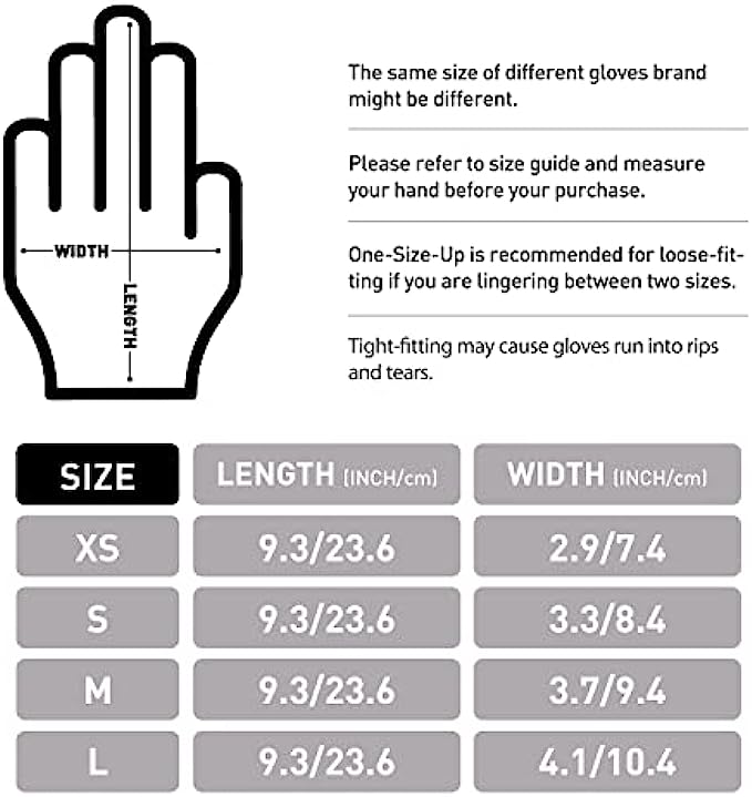 PROPER SIZE MATTERS - Vinyl disposable gloves are less form-fitting and elastic than latex or nitrile gloves, but more economical. Please refer to the size chart to find your own size. One-Size-Up is recommended if you are lingering between two sizes. Tight-fitting may cause gloves run into rips and tears. ENHANCED HAND PROTECTION - Crafted with 5 mil thick food grade high quality Polyvinyl Chloride (PVC). Provide good performance when your works encounter with dirty, dusty. More durable and convenient. COMFY FOR ALL - Smooth texture ensures tactile sensitivity to feel fine parts. Able to operate mobile phone while wearing gloves. Packaged 50 Black vinyl disposable gloves per box. Come in small, medium, large and extra-large sizes, suitable for both men and women. SAFE CHOICE - General purpose latex-free and powder-free disposable gloves are perfect for those who are allergic to the latex, and do not have a powder coating inside the glove, reducing the risk of allergic reactions and contamination. HIGHLY VERSATILE - Perfect for cooking, food handling, BBQ, gardening, cleaning, hair coloring etc. Suit for household and commercial situations like kitchen, laboratory, restaurants, public service, beauty hair salon, veterinary, and more.
