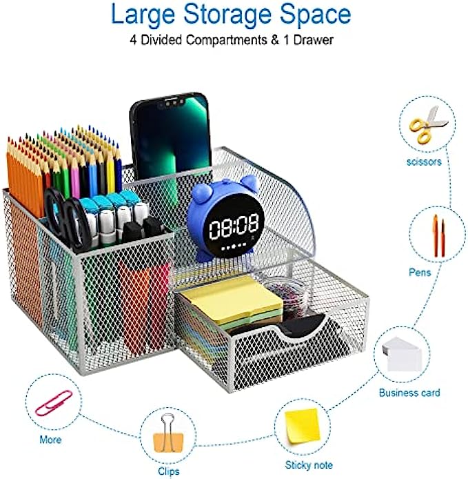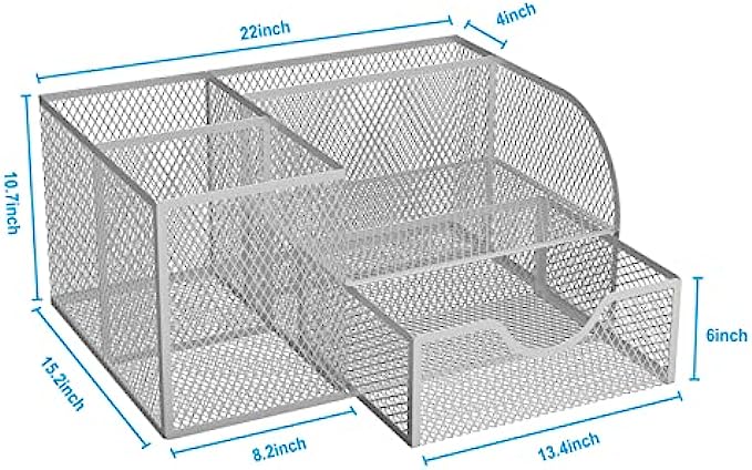 Office Supplies Desk Organizer Caddy for Organization and Accessories with 4 Compartments + 1 Sliding Drawer, Mesh Desk Organizers with Pen Holder for Home School College Dorm Women Desktop, Silver