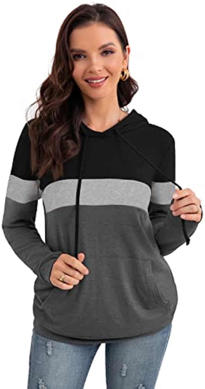 PrinStory Womens Hoodies Pullover Sweatshirts Tunic Top Color Block Long Sleeve Fall Drawstring Tops With Pocket
