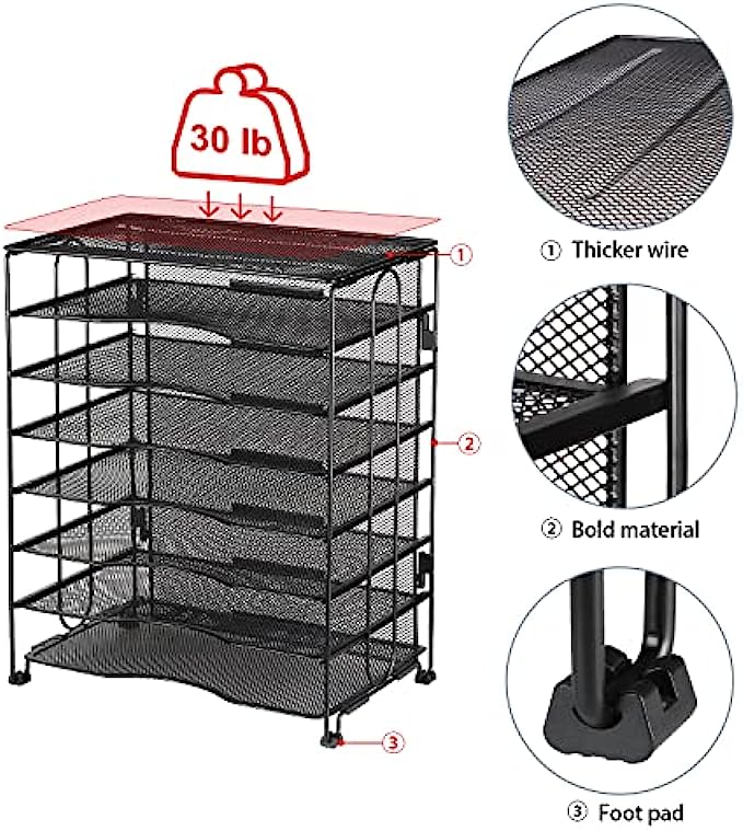 Solid Structure - the letter tray holder is made of 0.15”(3.8mm) steel wire mesh and solid thick frame. The welding is very firm, and the rubber anti slip foot pad is added to prevent sliding and avoid surface scratches. It is solid and durable.
