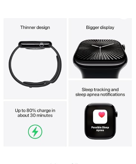 WHY APPLE WATCH SERIES 10 — Bigger display with up to 30 percent more screen area.* A thinner, lighter, and more comfortable design.* Advanced health and fitness features provide invaluable insights.* Safety features connect you to help when you need it.* Faster charging gives you 80 percent battery in about 30 minutes.*