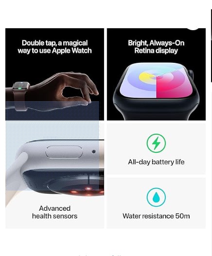 WHY APPLE WATCH SERIES 9 — Your essential companion for a healthy life is now even more powerful. The S9 chip enables a superbright display and a magical new way to quickly and easily interact with your Apple Watch without touching the screen. Advanced health, safety, and activity features provide powerful insights and help when you need it. And redesigned apps in watchOS give you more information at a glance.