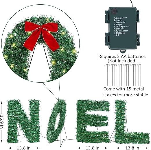 ?【PRE-LIT 132 LED LIGHTS】This set of 3 artificial Christmas NOEL letters yard light is pre-strung with 132 battery operated warm white LED lights (Need 3 AA batteries, not included), has 8 different modes to satisfy your needs, bring a charming and festive glow to light up your house. With 6-hour automatic timer, it will turn off after 6 hours of lighting and light up again after 18 hours.