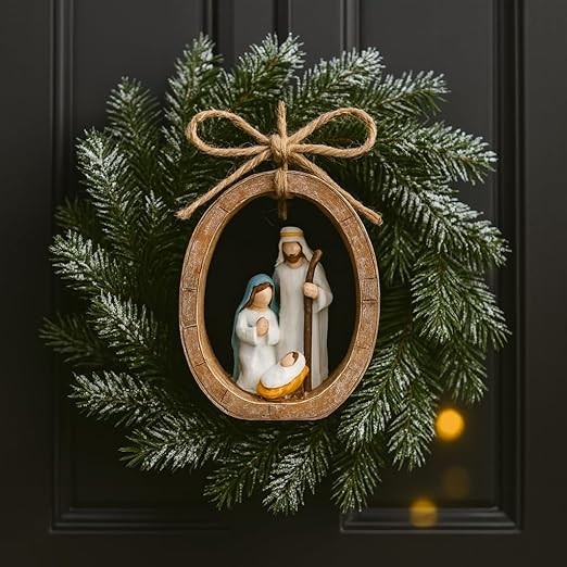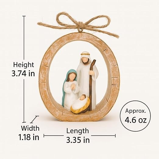 • Hand-painted resin nativity set: Mary, Joseph and Baby Jesus inside an oval faux-wood ring for a timeless, reverent look.