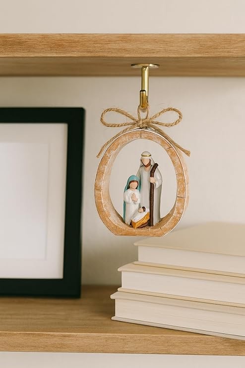 Holy Family Oval Nativity Set Hanging Christmas Ornament, Hand-Painted Resin with Jute Bow, Rustic Faux-Wood Ring, Religious Gift Xmas Tree/Wreath Décor (Nativity Scene)