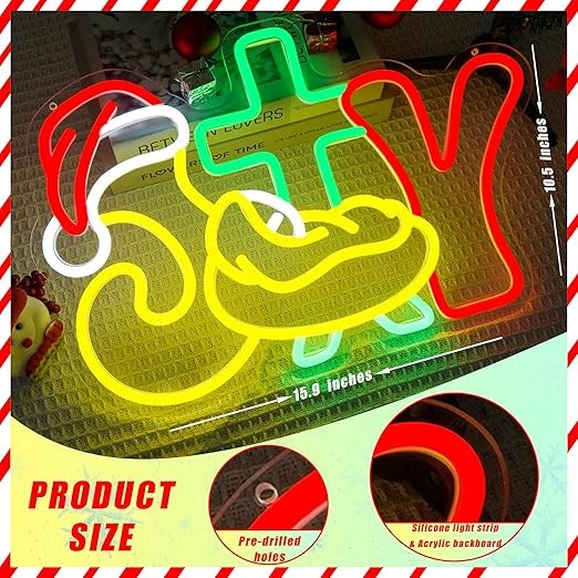 Festive and Religious Fusion:This neon sign beautifully combines the joy of the holiday season with religious symbolism. The letter 'J' is adorned with a Santa hat, while the 'O' features a baby figure with a cross above it, representing Jesus Christ. It's a perfect blend of festive cheer and spiritual significance.