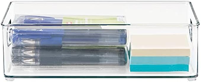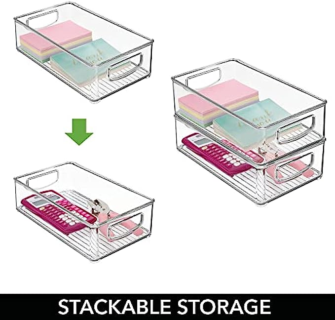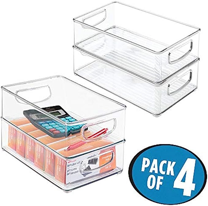 mDesign Small Plastic Office Storage Container Bins with Handles for Organization in Filing Cabinet, Closet Shelf, or Desk Drawers, Organizer for Notes, Pens, Pencils, and Staples - 4 Pack - Clear