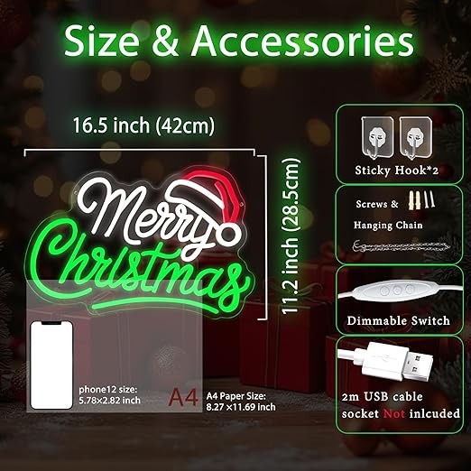 • Power-saving and Safe: This christmas neon sign for wall decor is made of acrylic back panel, LED lights, silicone strip. Low energy consumption. Compared with old glass neon lights, it is brighter, safer, green, no noise, no over-heating